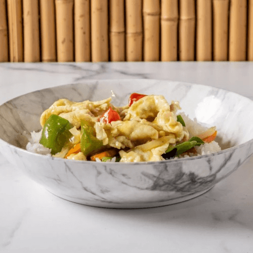 Rice noodle, chicken, shrimp, roasted pork, curry style