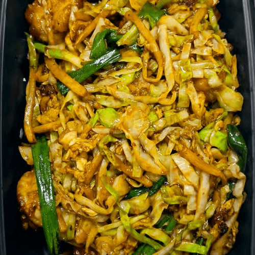 egg noodle, shrimp , chicken and roasted pork, onion and vegetables