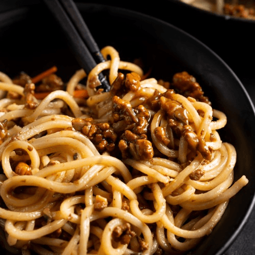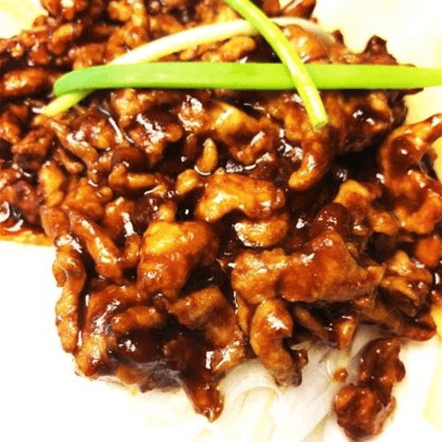 Shredded pork marinated and sautéed with Chinese soybean pasted, topped with finely chopped scallion