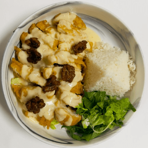 Chicken breast medallions finished with creamy citrus flavor sauce & sprinkled with candy walnuts