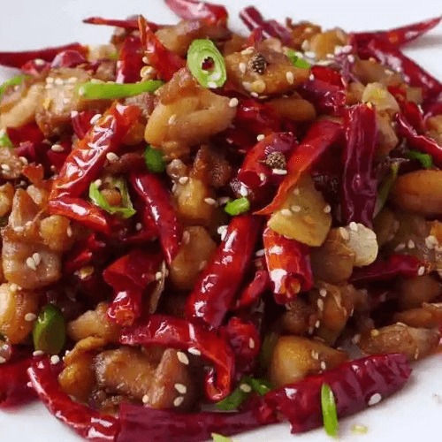 Hot. Chicken breast sautéed with jalapeño, onion, carrot and celery in brown sauce