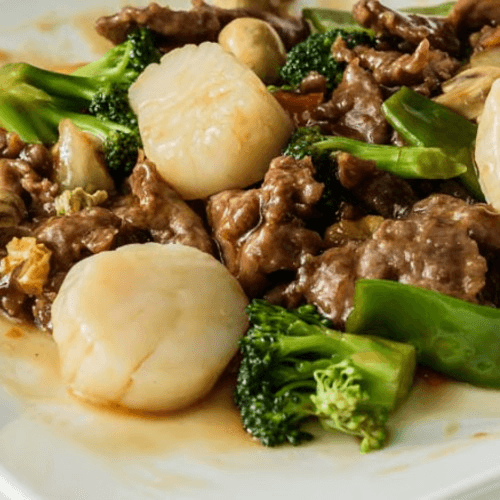 Beef with scallop with fresh garden vegetables served on sizzling plate