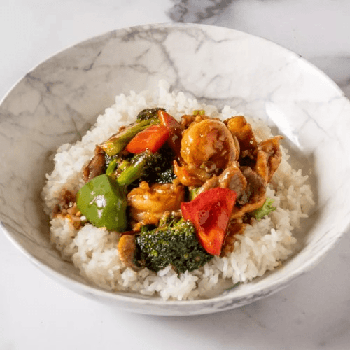 Rum-infused teriyaki sauce and fresh orange segments, bell peppers and snow peas
