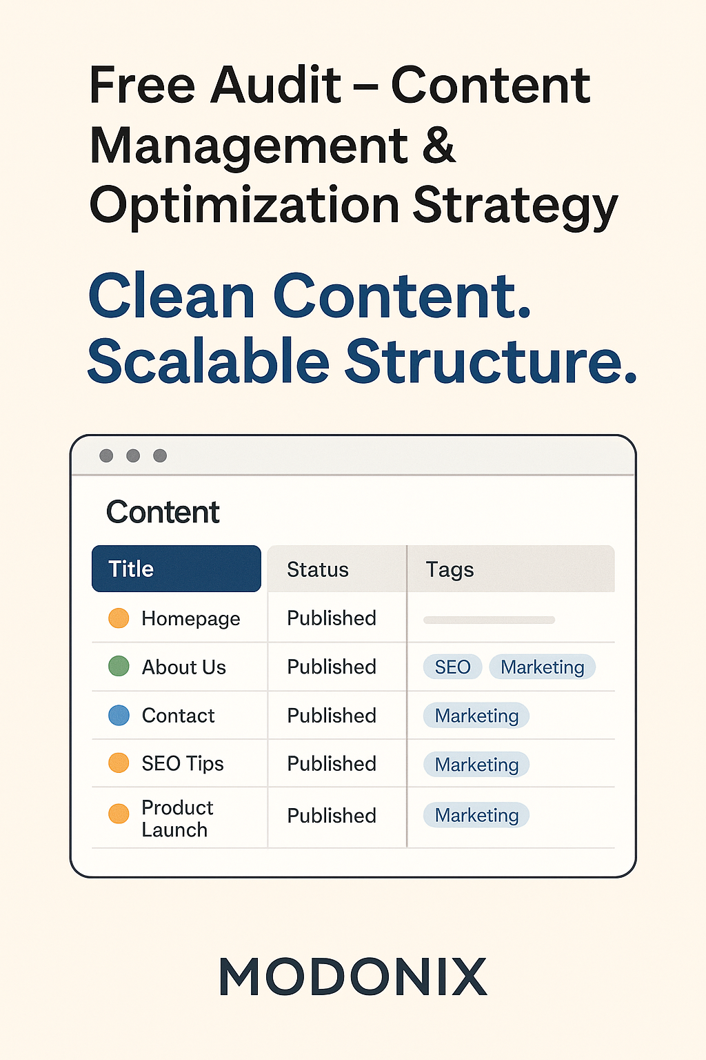 Bring Order to the Chaos — Smarter Content, Better Results At Modonix, we help businesses clean up, organize, and scale their content libraries — so you spend less time hunting down assets and more time getting results. If your team is juggling blogs, SEO pages, product descriptions, social content, and inconsistent folders... it’s time for a content management system built to scale. We offer a Free Content Management Audit to help you assess your current workflow, identify inefficiencies, and design a system that works.