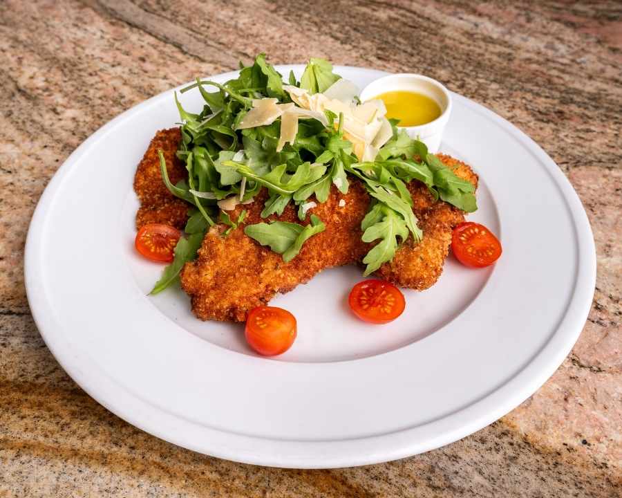 Deep-fried breaded chicken or veal medallions topped with arugula, cherry tomatoes, Parmesan, and a side of lemon oil dressing