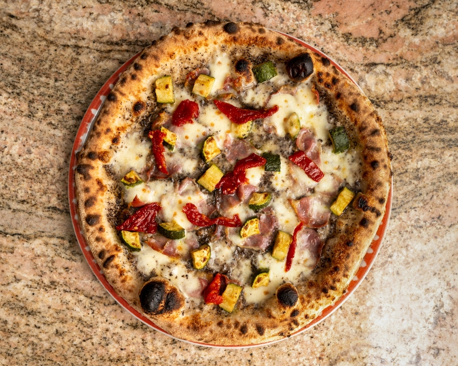 San Marzano tomato, fresh mozzarella artichoke, Kalamata olives, ham, and mushroom