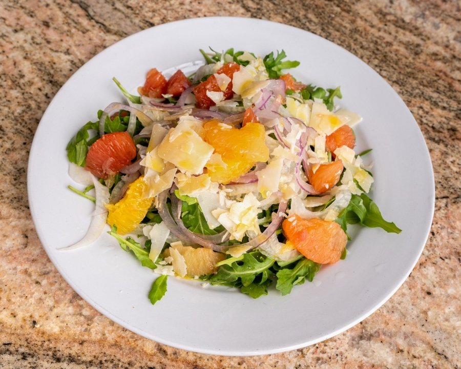 Shaved Fennel, Arugula, Citrus Segment, Red Onions, Shaved Parmesan and Orange infused Olive Oil.