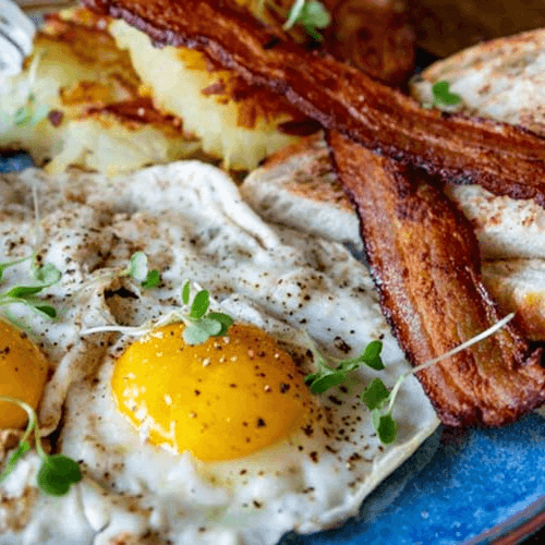 Two eggs, bacon, home fries, toast