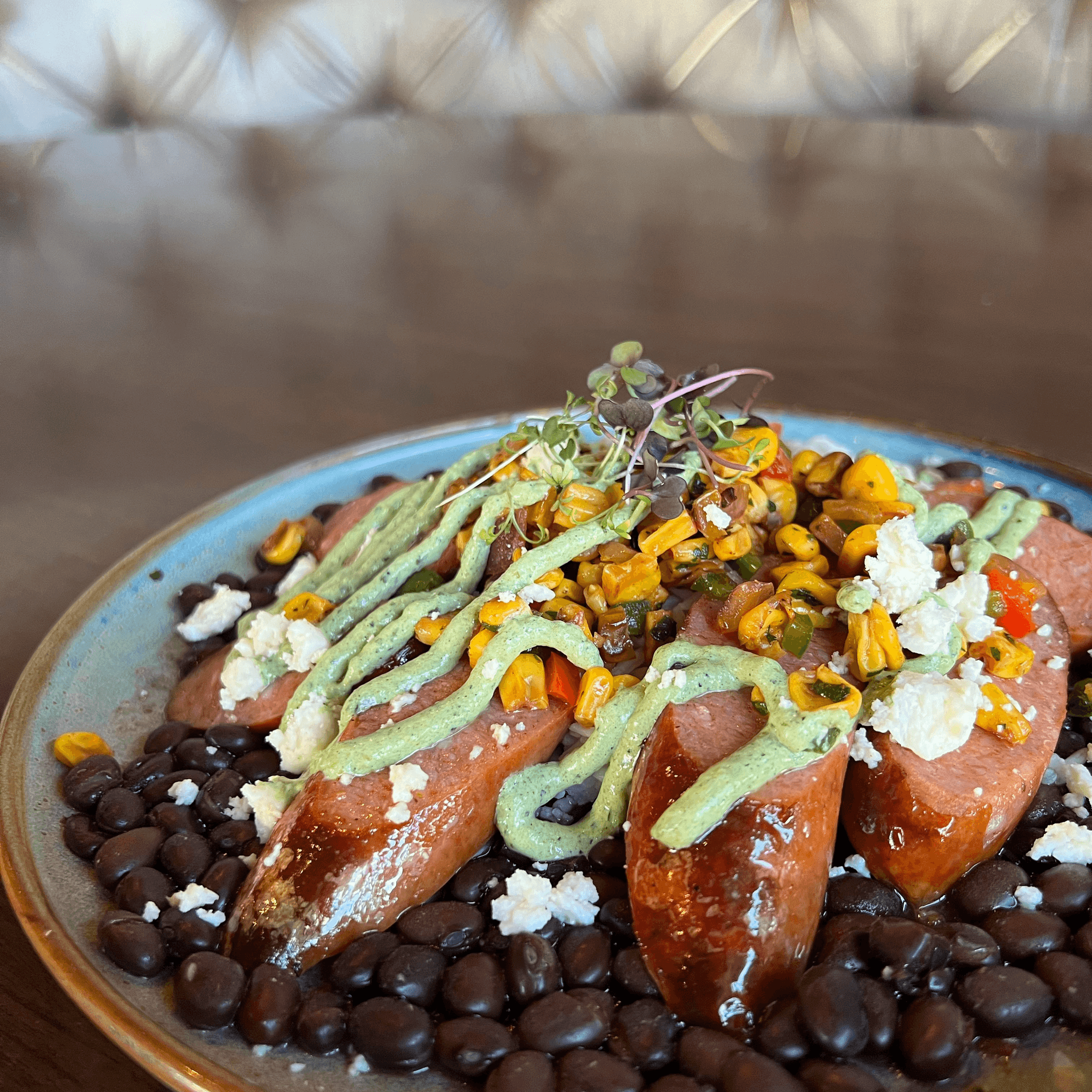 Seasoned black beans and rice, sausage, fire-roasted corn salsa, poblano crema, queso fresca (gluten-free)