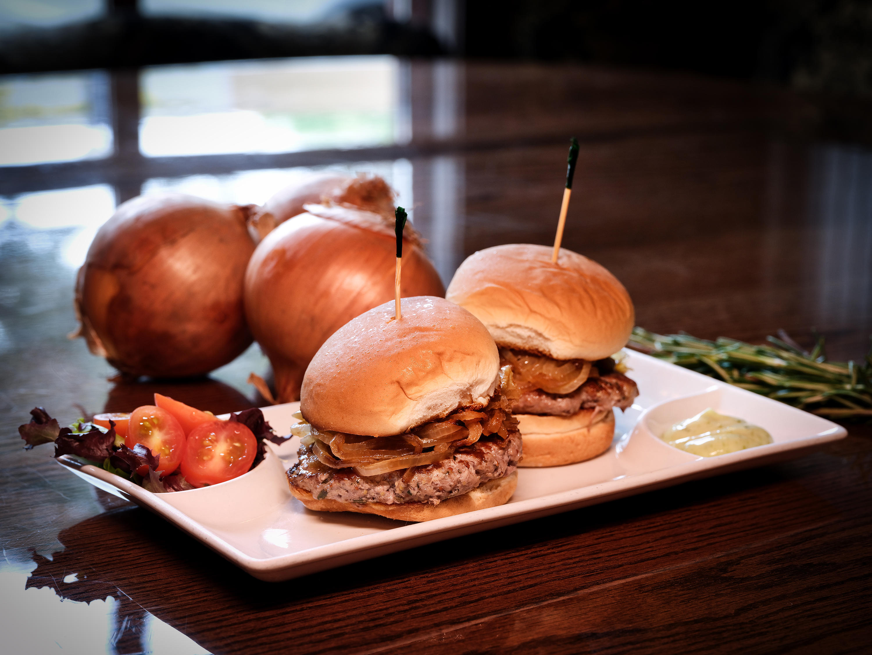 Ground lamb blended with rosemary, garlic, and whole grain mustard, griddled and served on toasted buns with caramelized onions and herb aoli.